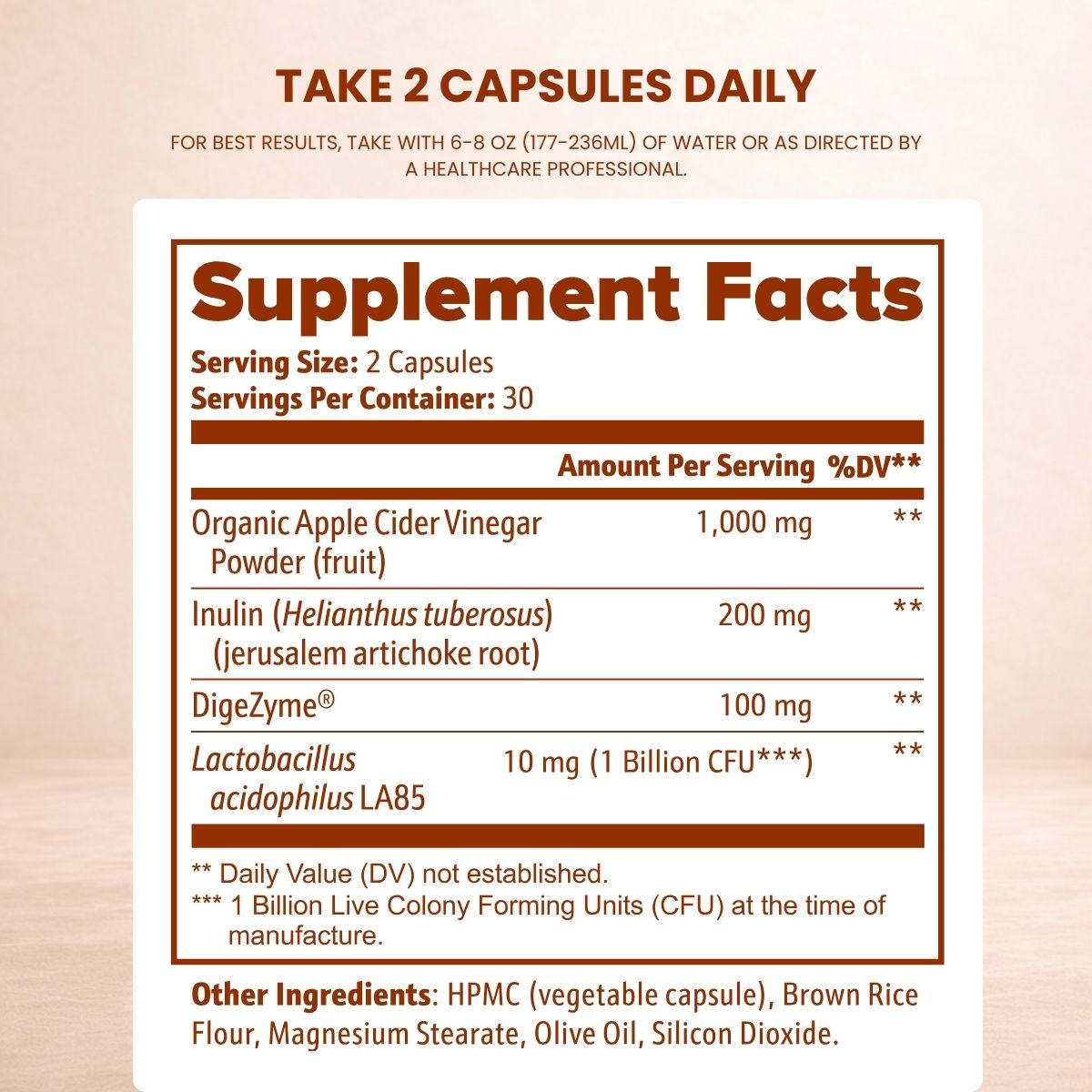 Adults take two (2) capsules daily, preferably before meals, or as directed by a healthcare professional.