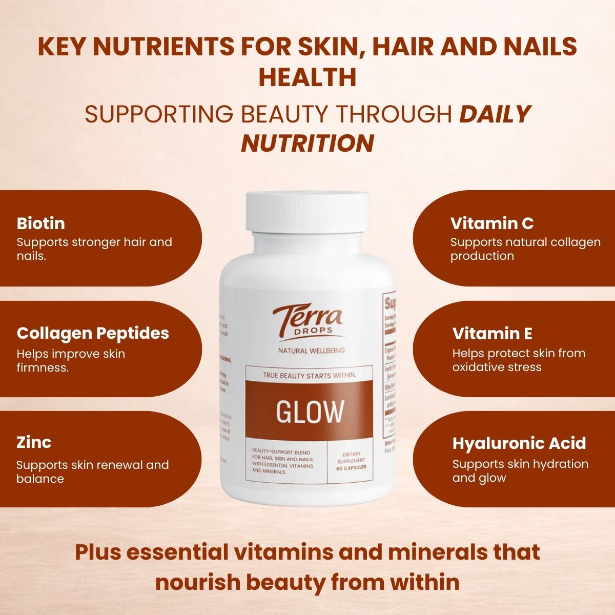 Terra Drops Glow was created for people who want stronger hair, healthier skin, and more resilient nails — not from makeup or shortcuts, but from a well-supported body.